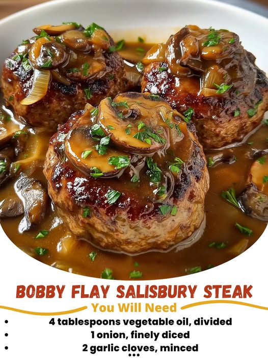 Bobby Flay’s Salisbury Steak is a flavorful, easy-to-make dish featuring juicy ground-chuck patties bound with egg, Parmesan & breadcrumbs, seared to perfection, and topped with a creamy mushroom-onion gravy enriched by tomato paste, Worcestershire sauce, beef broth, and a splash of cream.