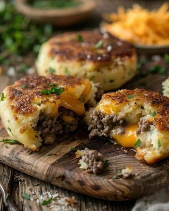 Enjoy your Cheesy Beef Stuffed Potato Cakes! They’re a perfect blend of crispy, cheesy, and savory flavors that are sure to be a hit.