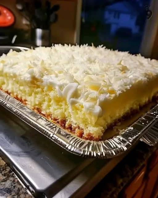 - Pour the filling over the cake: Slowly pour the coconut mixture over the cake, making sure it seeps into the holes. Let the cake absorb the mixture as it cools (you can gently spread it around with a spatula if needed). Allow it to cool completely, about 1 hour.