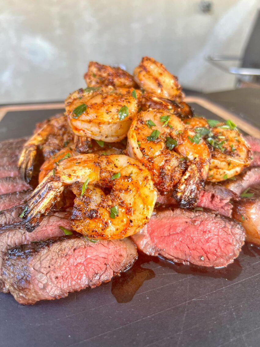 - Place the seasoned steaks on the preheated grill and cook to your desired level of doneness, flipping once halfway through. For medium-rare, cook for about 4-5 minutes per side, depending on the thickness of the steaks. Remove the steaks from the grill and let them rest while you prepare the shrimp.