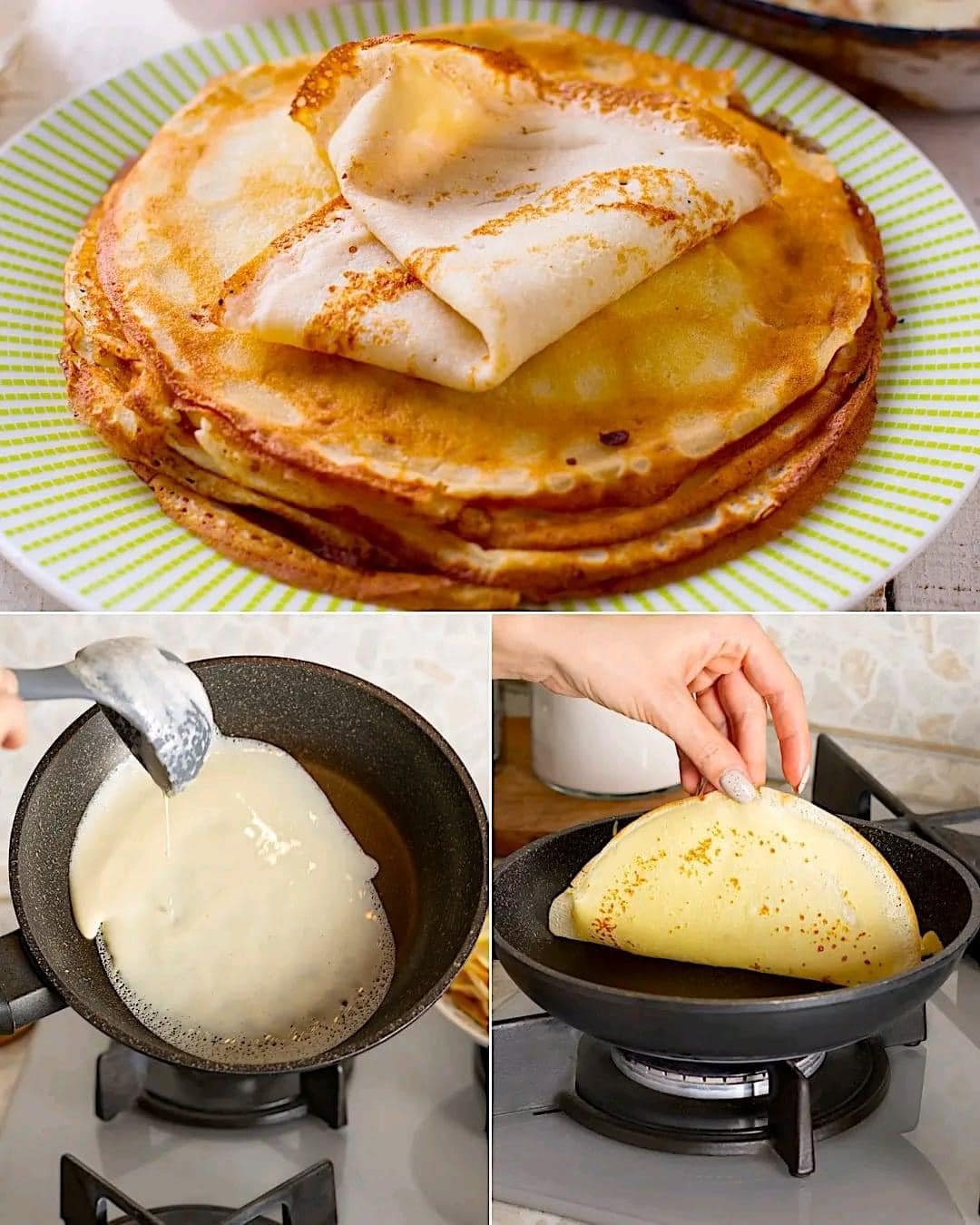 Remove the crepe from the pan and place it on a plate. You can stack the cooked crepes on top of each other as they won’t stick. Repeat the process with the remaining batter, adding a little more butter or oil to the pan as needed to prevent sticking.