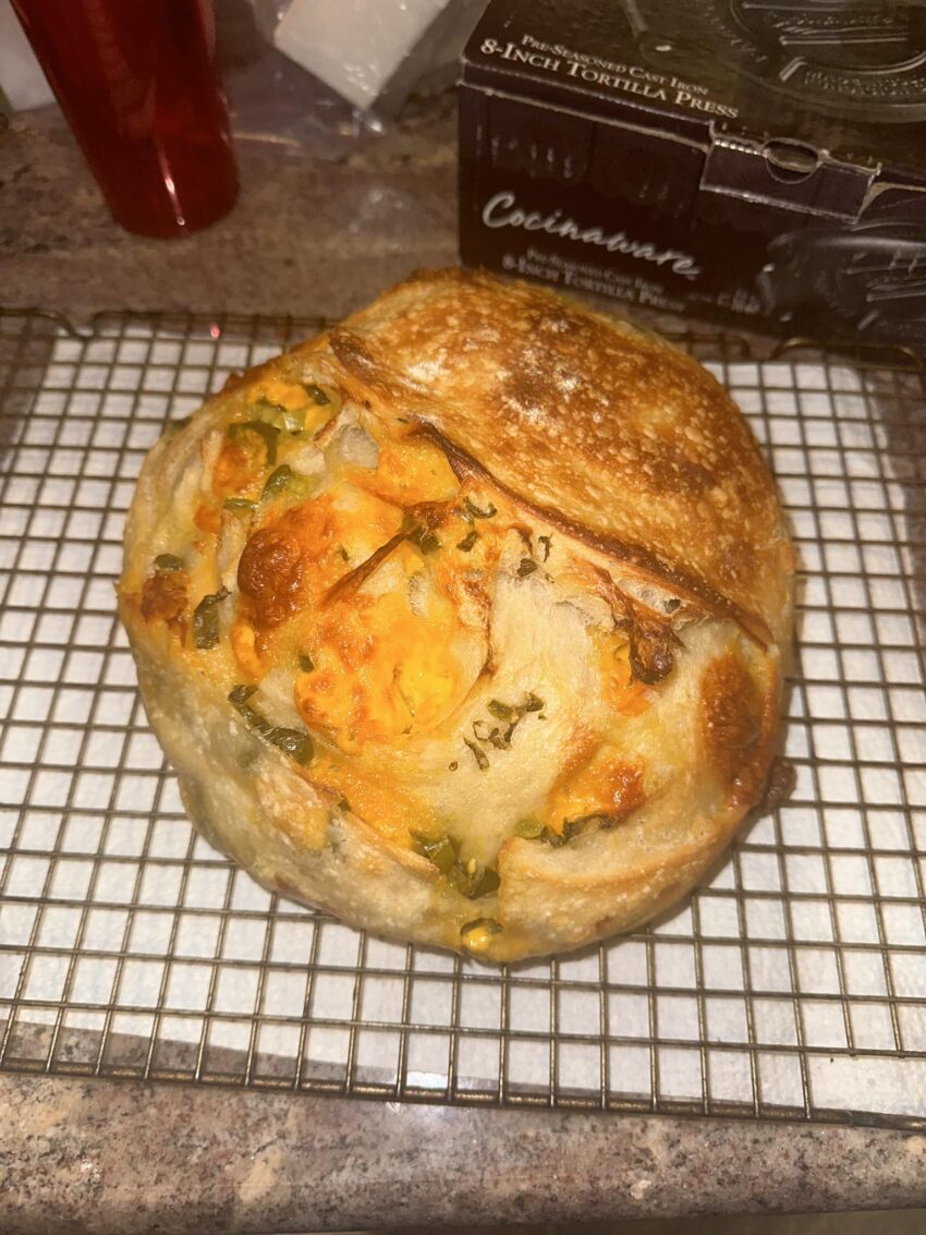 - Punch down the risen dough and knead in the shredded cheddar cheese and chopped jalapeños until evenly distributed throughout the dough.