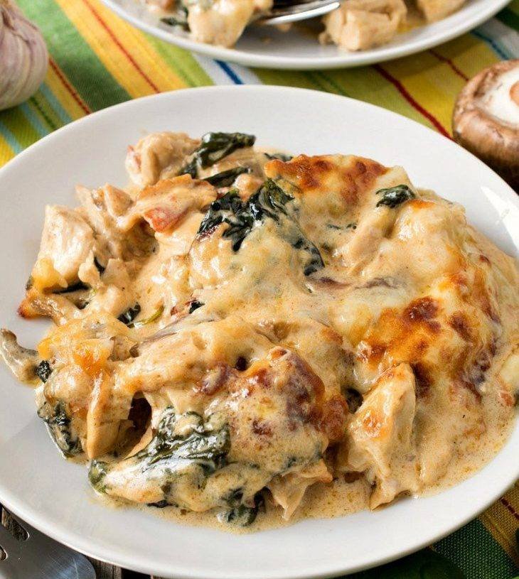 - Bake in the preheated oven for about 25-30 minutes or until the chicken is cooked through and the cheese is golden and bubbly.