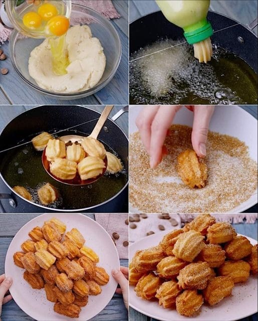 • Fry the mini churros in batches, making sure not to overcrowd the pan, until they are golden brown and crispy, about 2-3 minutes per side.