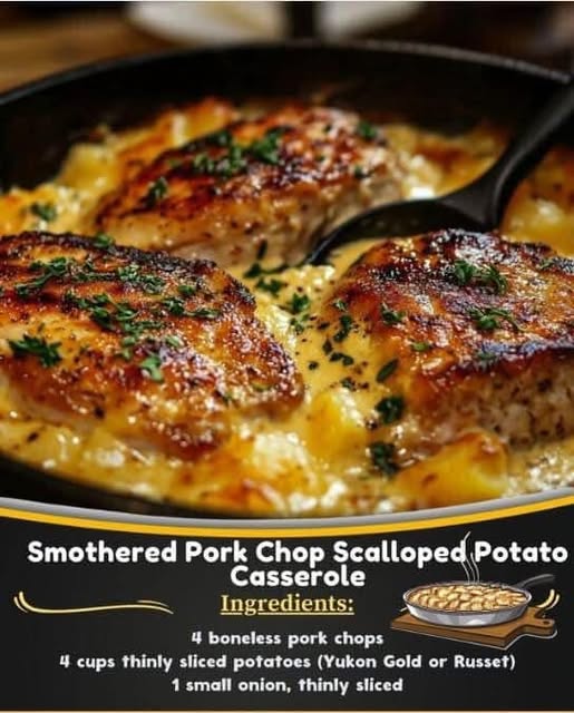 Smothered Pork Chop Scalloped Potato Casserole is a comforting, hearty dish that combines tender pork chops with creamy, cheesy scalloped potatoes. It’s the ultimate comfort food with layers of flavor, perfect for a family dinner or a special occasion. Here’s a recipe for this delicious casserole: